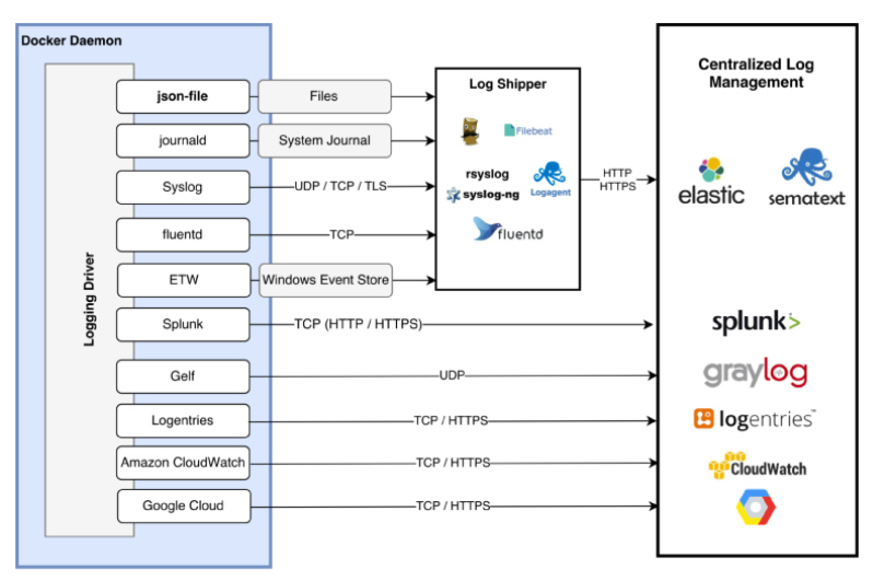 도커는 다양한 로깅 메커니즘을 포함하고 있습니다. 각 메커니즘들은 우리는 logging driver 라고 부릅니다. 기본적으로 local file, json-file, syslog, fluentd와 구글 클라우드, 아마존 클라우드에서 제공하는 logging driver까지 여러 드라이버가 존재합니다. 해당 드라이버 중 몇가지에 대한 사용법은 아래에서 알아보겠습니다. 여기서는 logging driver에 대한 설정에 대해 정리하겠습니다.