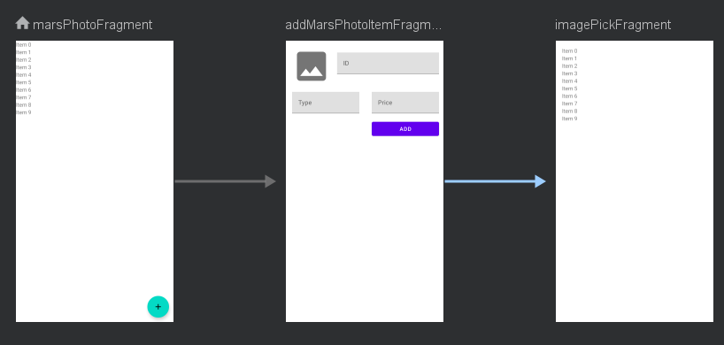 각 프레그먼트는 버튼으로 프레그먼트 간 이동 인터렉션이 발생한다. 우리가 중점적으로 테스트 하려는 부분이 이 인터렉션 부분이다.